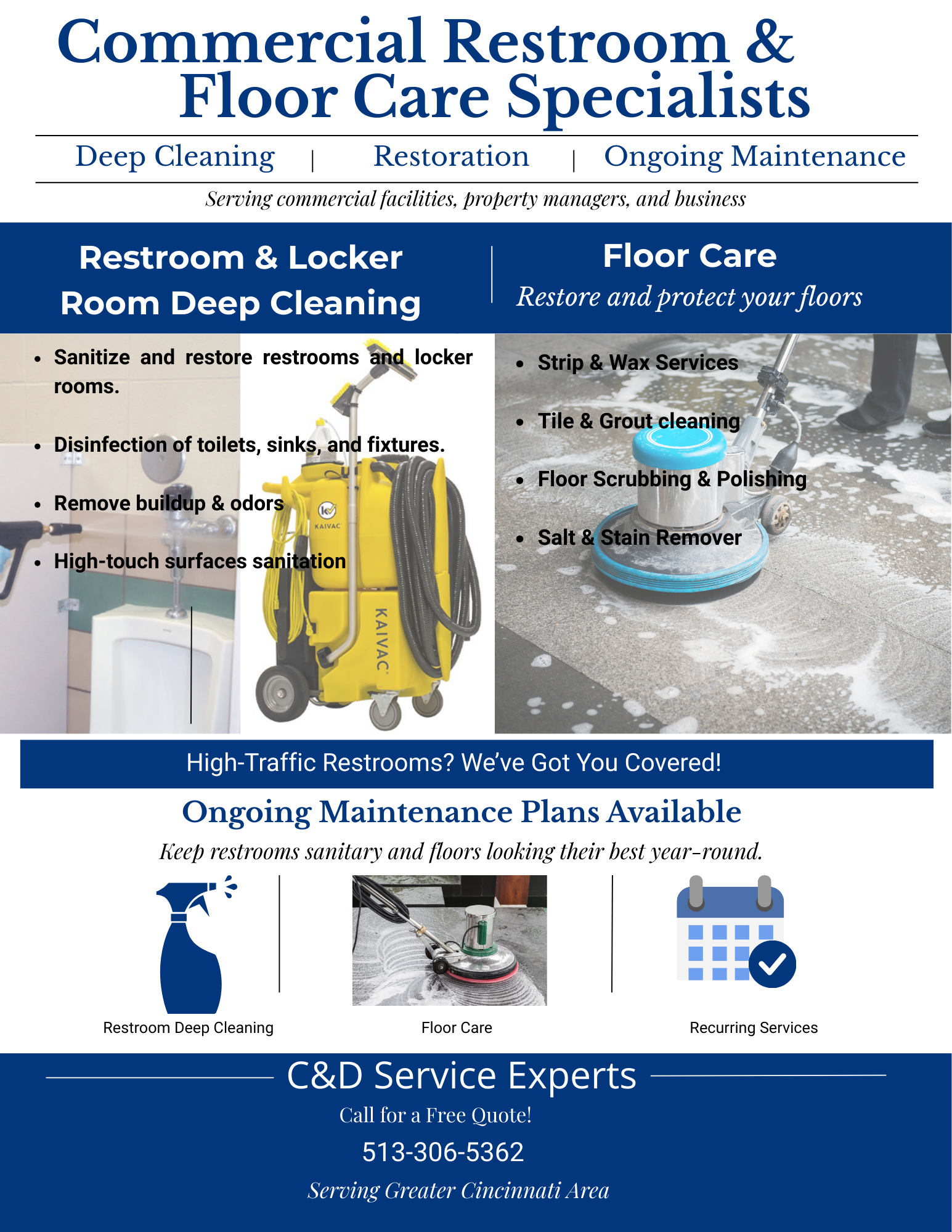 At C&D Service Experts, a commercial cleaning company founded in 2021, we are your trusted partner for comprehensive facility solutions in the Greater Cincinnati area. Our commitment to excellence is evident in our range of specialized services designed to help businesses and organizations maintain clean, safe, and inviting environments.